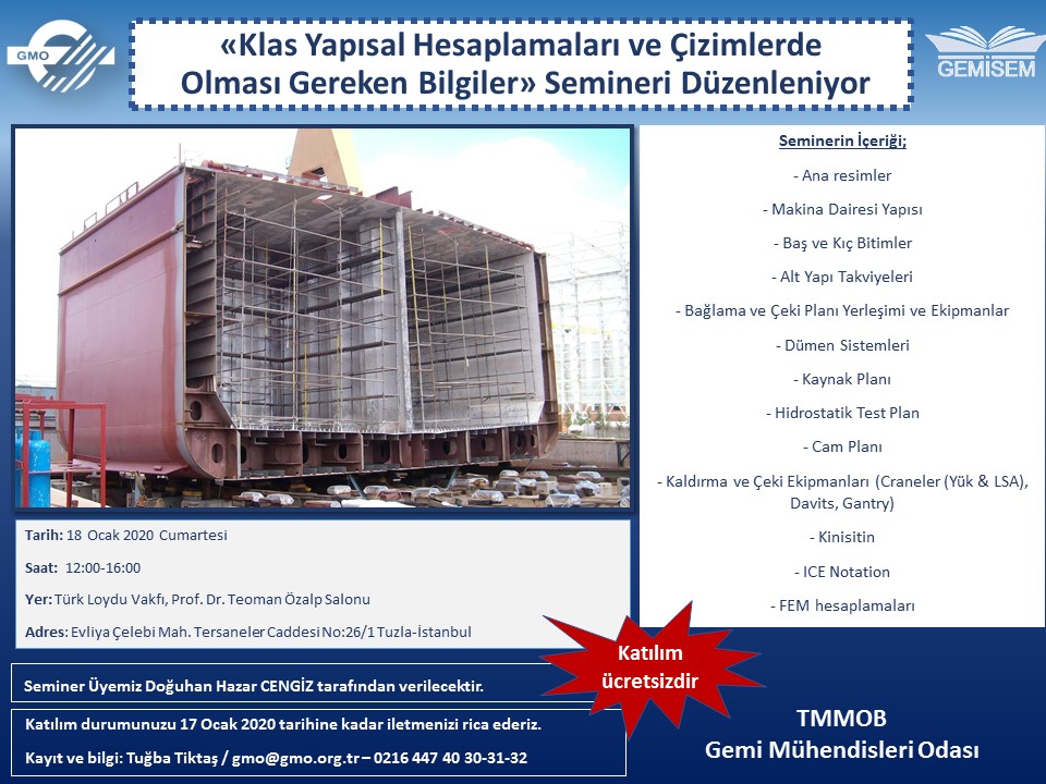 İlgi yazı ile Gemi Mühendisleri Odası GEMİSEM tarafından "Klas Yapısal Hesaplamaları ve Çizimlerde Olması Gereken Bilgiler Semineri" nin 18 Ocak 2020 tarihinde Türk Loydu Vakfı Prof.Dr.Teoman ÖZALP Konferans Salonu'nunda gerçekleştirileceği beliritilerek Üyelerimize duyurulması talep edilmektedir.